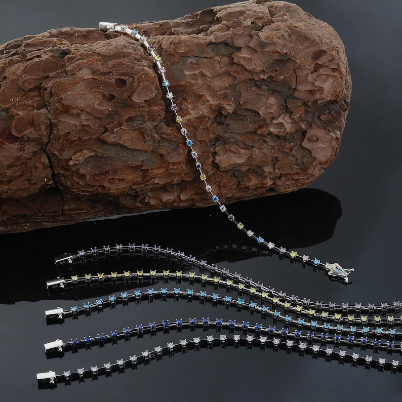 Add vibrant elegance to your style with the Rainbow Colorful Sapphire Tennis Bracelet, crafted from 925 sterling silver and set with lab-grown sapphire gemstones in a rainbow of colors. This bracelet combines timeless sophistication with a playful, modern twist, making it perfect for both casual wear and special occasions.
